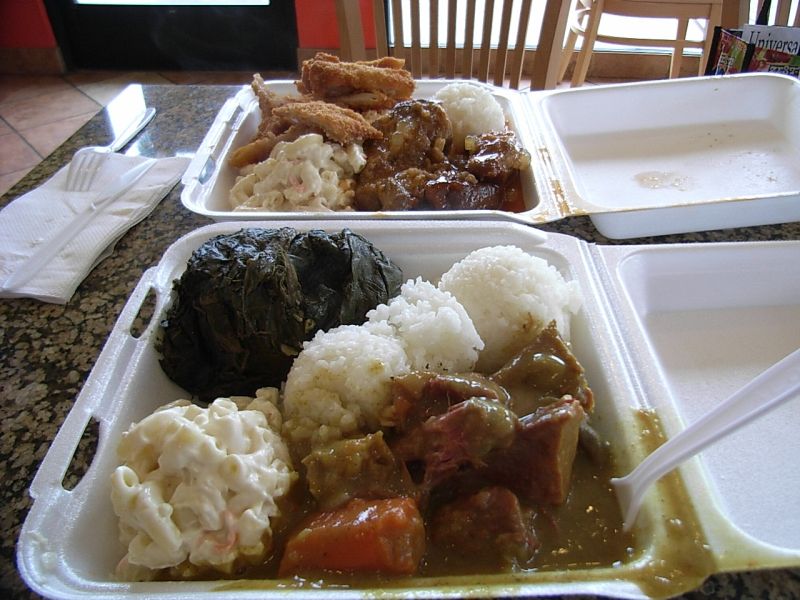・・・何頼んだらこれ出てきたんだか忘れましたが、『ラウラウ』というハワイアンフード(左上の深緑色の塊ね)が気になったので、それが付いてる奴にしたのは覚えてます。20cm角×10cm程度の厚みのある容器です。ボリュームあるの判っていただけます?味はなかなか良かったです・・・量多いから食べ飽きるけどね。
