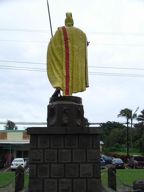 Hawiの街で休憩した後ドライブ再開・・・と思ったら、そう走らずにまたショップの前に駐車。???と思いつつも車降りると道路隔てた向こうにカメハメハ大王像・・・これ一人で車走らせてたら絶対気付かずに通過する自信があります。そのくらい、何の変哲もないところに設置されています。
