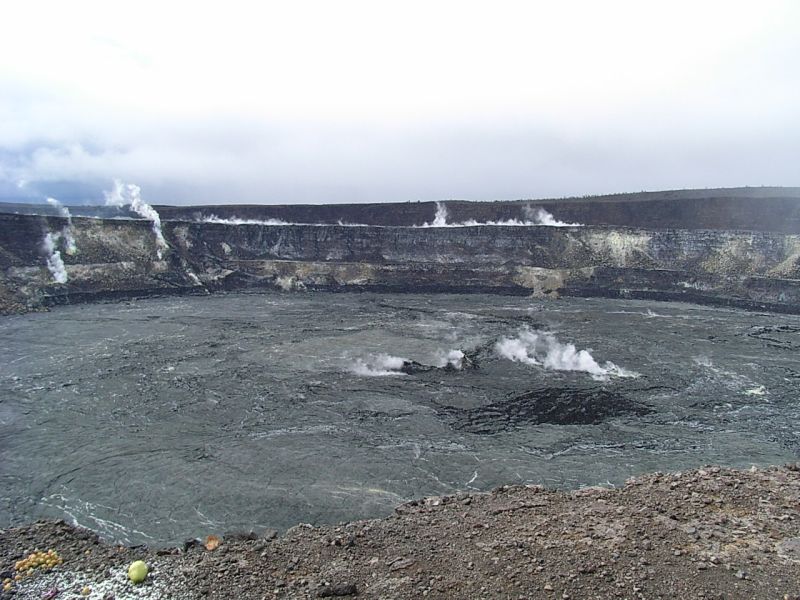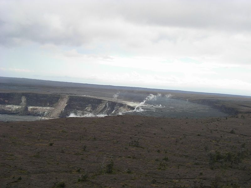 まだまだ見所は続きますよ~。次は先ほど見たハレマウマウ火口を近くの展望台から。ここは、硫黄臭がきついので呼吸疾患や妊婦さんは来ないほうが懸命です。広大すぎて、さっきどこから見たんだか判らないくらい。まだ生きてる火山なので、火口までの道はところどころ硫黄で黄色いし、地面を触ると温かくもあります。