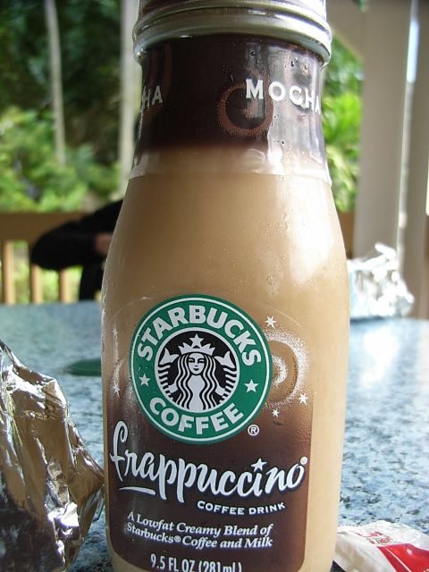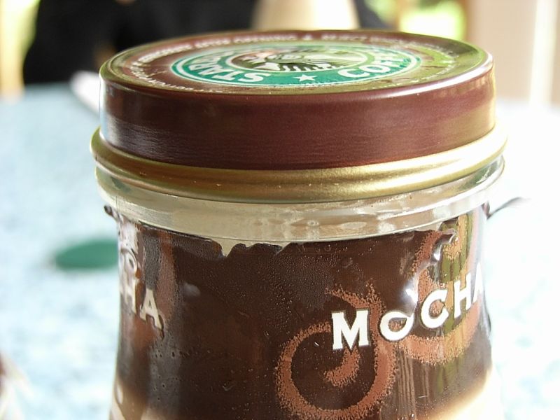 お店には食パンのほか、サンドイッチ(ホット/コールド)とかハンバーガーとかあって、私は(っていうか結局3人とも)チーズバーガー。飲み物はスタバのモカフラペチーノ(瓶)外のテーブルでいただきます。