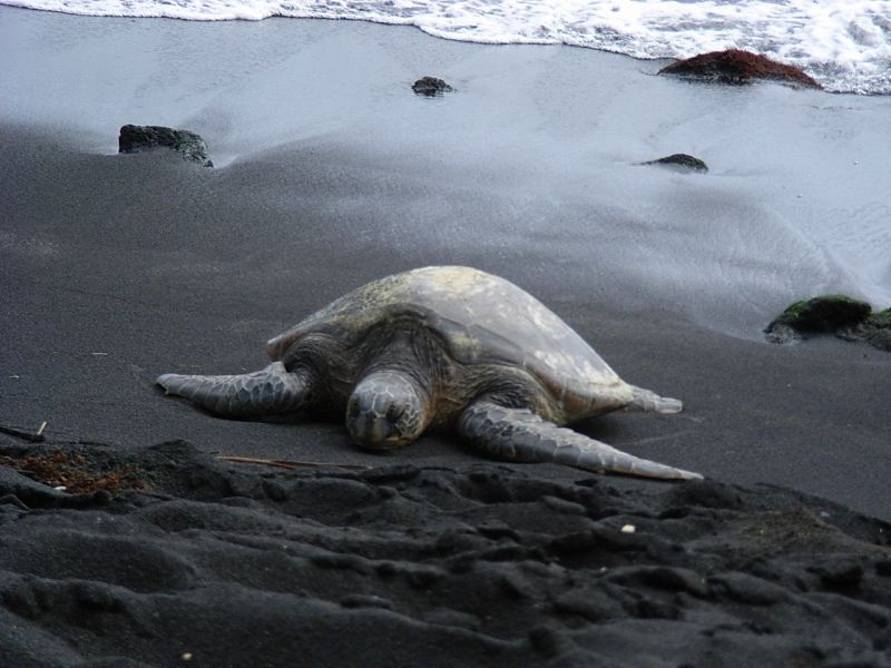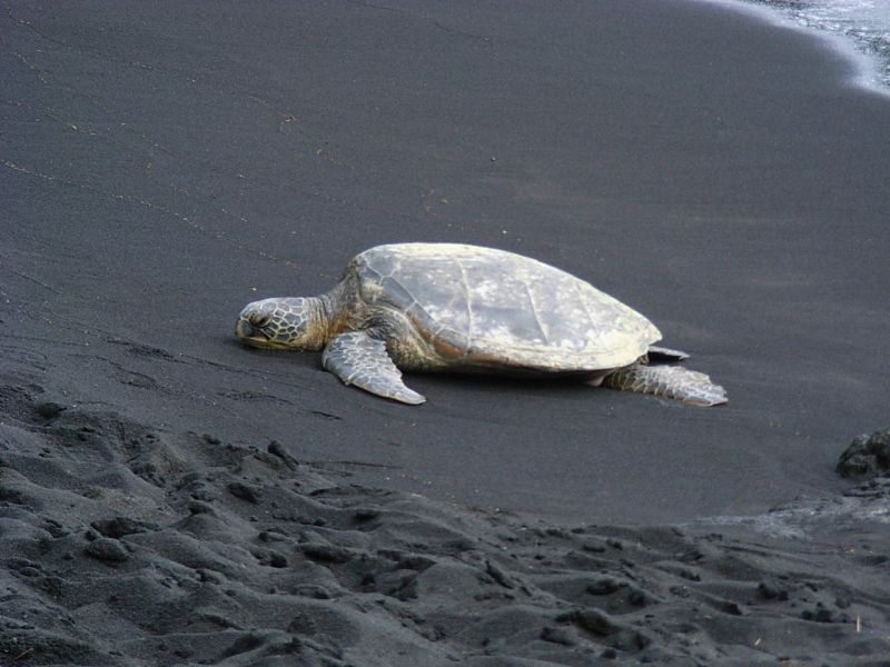 車は「プナルウ黒砂海岸」へ。ここの砂は溶岩が細かく砕かれて砂状になったもので、カメスポットでもあるそうです。