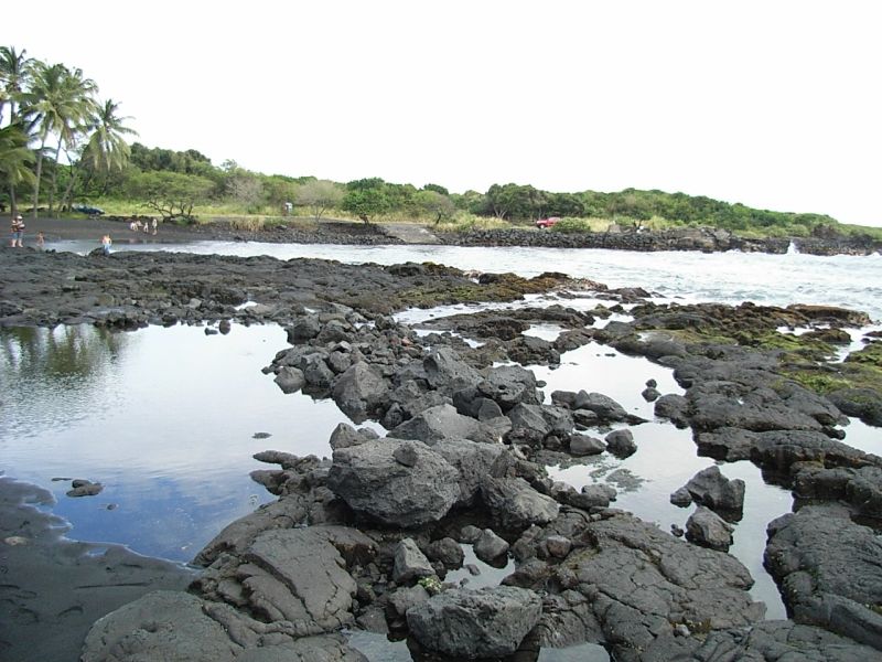 サウスポイントの近くにグリーンサンドビーチというビーチがあるんですが、そこの砂は溶岩の中に含まれていたペリドット(売り物にならないような成分の石)が溶岩より軽いために潮の流れでサウスポイント近くに堆積したんだそうな。溶岩の大半を占めている重くて黒い砂がここに堆積して黒砂海岸となった、というわけ。なので、この砂の中にも僅かですが緑色の砂があります。